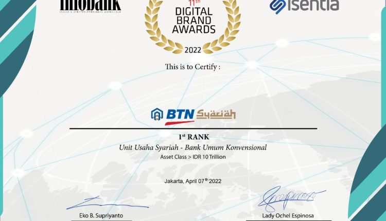 Jakarta – BTN Syariah yang adalah unit usaha syariah (UUS) dari PT Bank Tabungan Negara (BTN), berhasil membawa pulang dua penghargaan sekaligus di ajang 11th Infobank Digital Brand Award 2022 pada Kamis, 7 April 2022, bertempat di Hotel Shangri-La Jakarta. Kedua penghargaan itu, yakni Best Overall Unit Usaha Syariah Bank Umum Konvensional untuk Corporate Brand (Peringkat 1) dan Unit Usaha Syariah Bank Umum Konvensional untuk Corporate Brand (Peringkat 1).