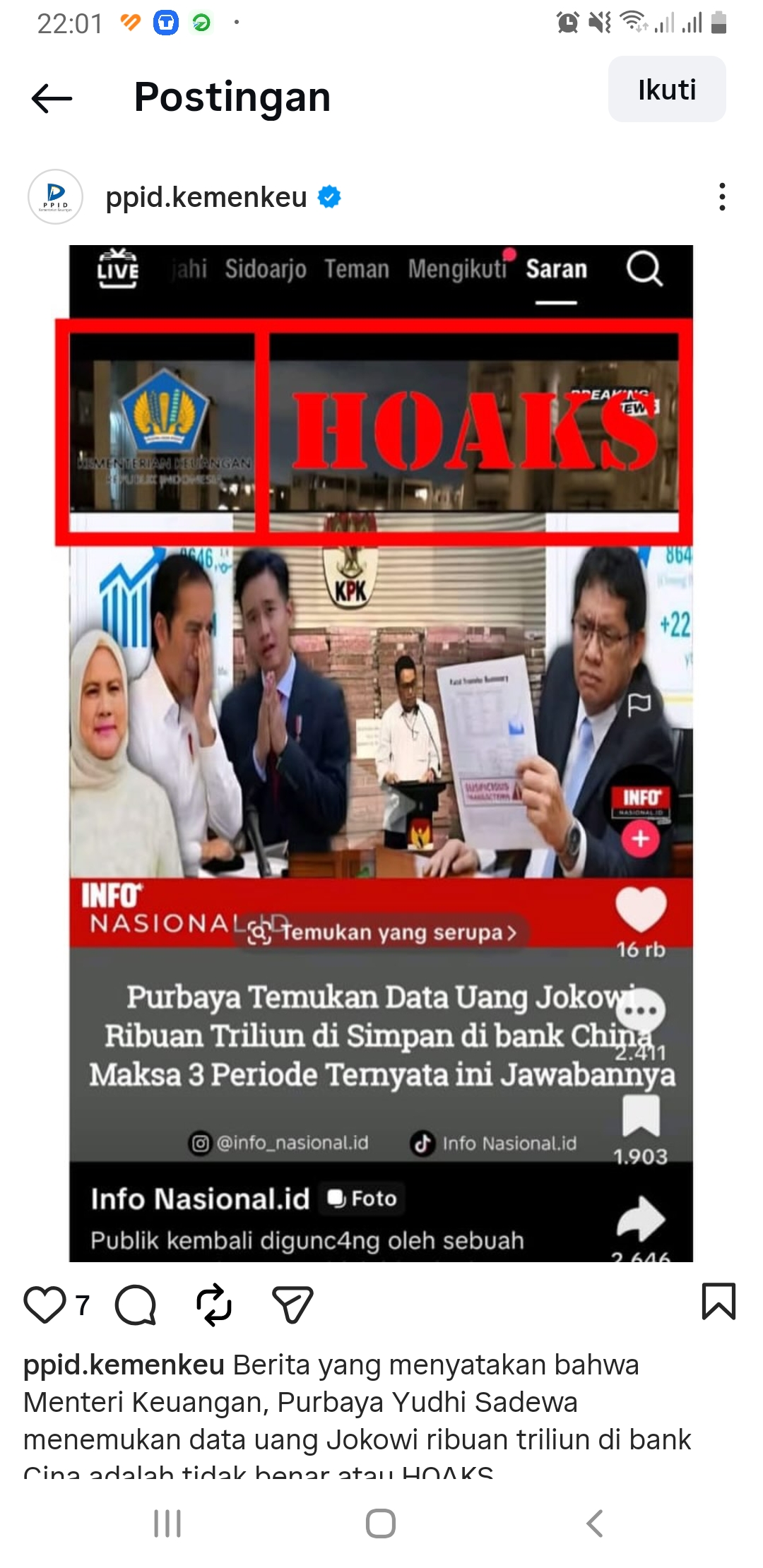 Terkait hal tersebut, Kementerian Keuangan langsung membantahnya lewat akun sosial media resmi ppid.kemenkeu.